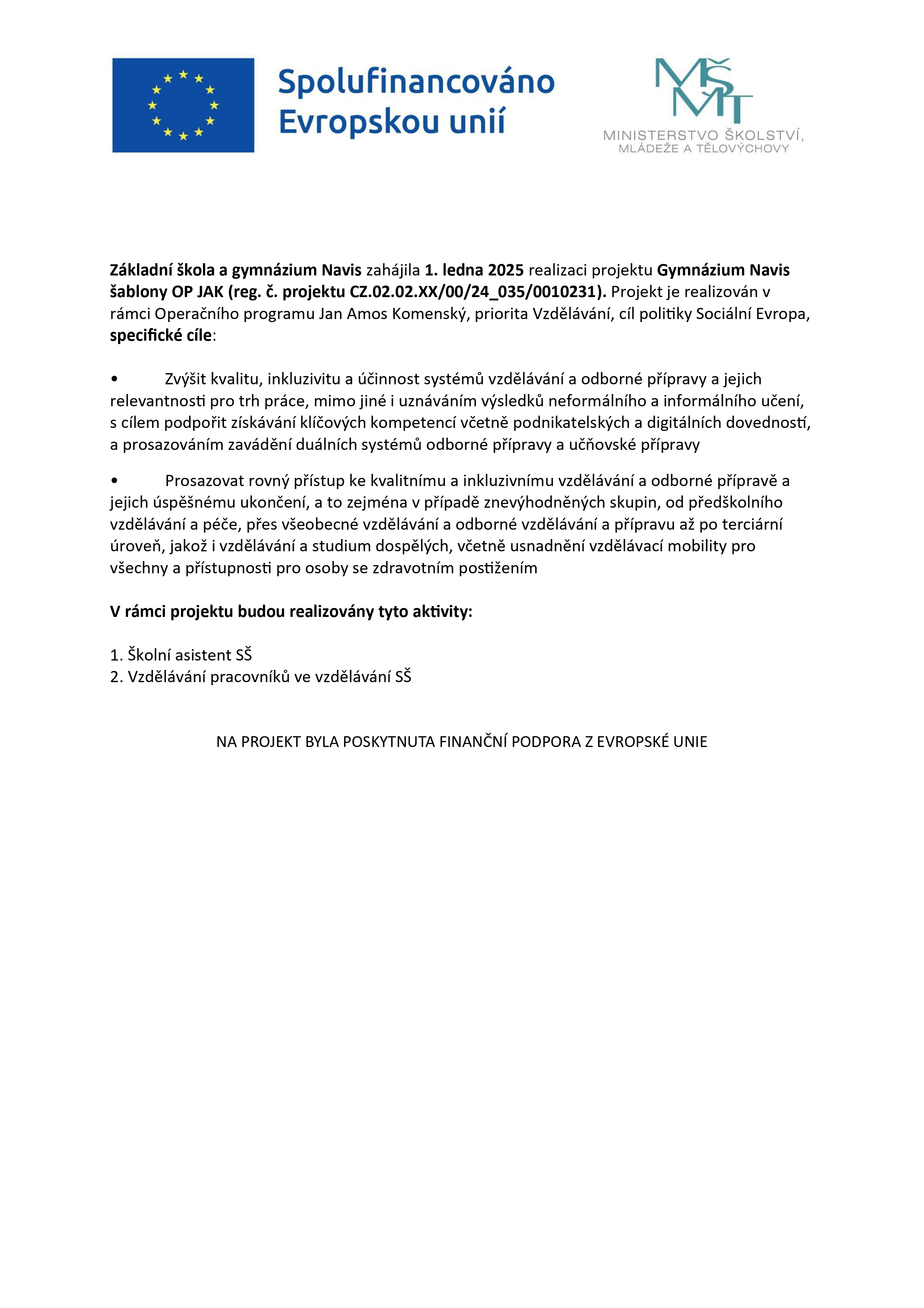 Základní škola a gymnázium Navis zahájila 1. 7. 2023 realizaci projektu ZŠ Navis šablony OP JAK (reg. č. projektu CZ.02.02.XX/00/22_002/0005641). Projekt je realizován v rámci Operačního programu Jan Amos Komenský, priorita Vzdělávání, cíl politiky Sociální Evropa, specifické cíle:
